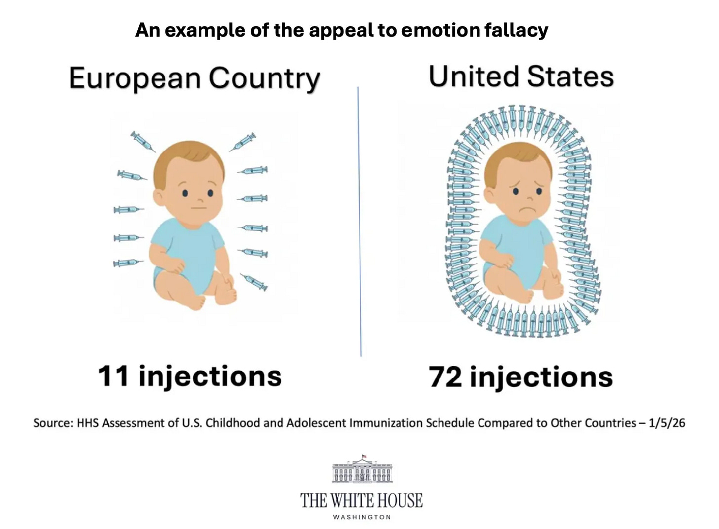 The image below is a great example — it was used to try to convince Americans that children in the US receive too many vaccines. Instead of providing accurate data, the image triggers an emotional reaction by using images of lots of needles which feels scary, and by showing the US baby as unhappy (frowning).