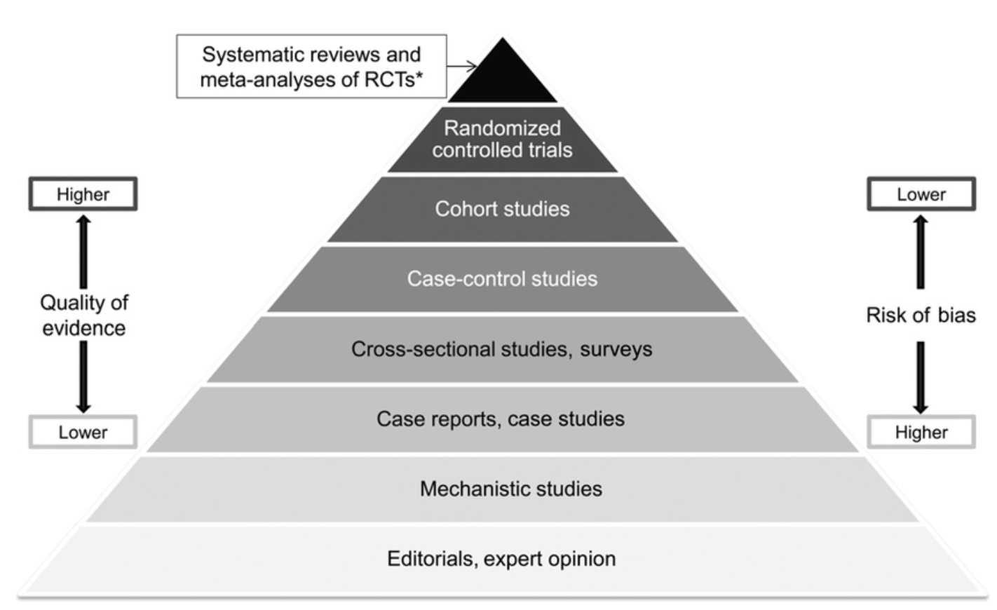 The hierarchy of evidence is supposed to help us with this communication challenge. This pyramid provides a general guideline on what types of evidence are considered more or less reliable – case reports of a single patient are less reliable than cross-sectional observational studies of many patients, which are less reliable than randomized controlled trials.