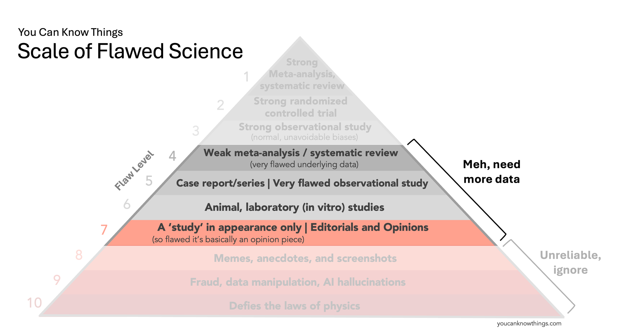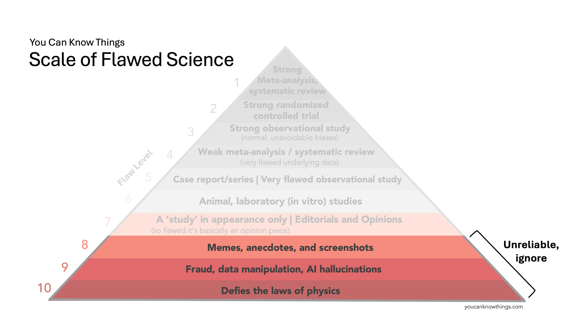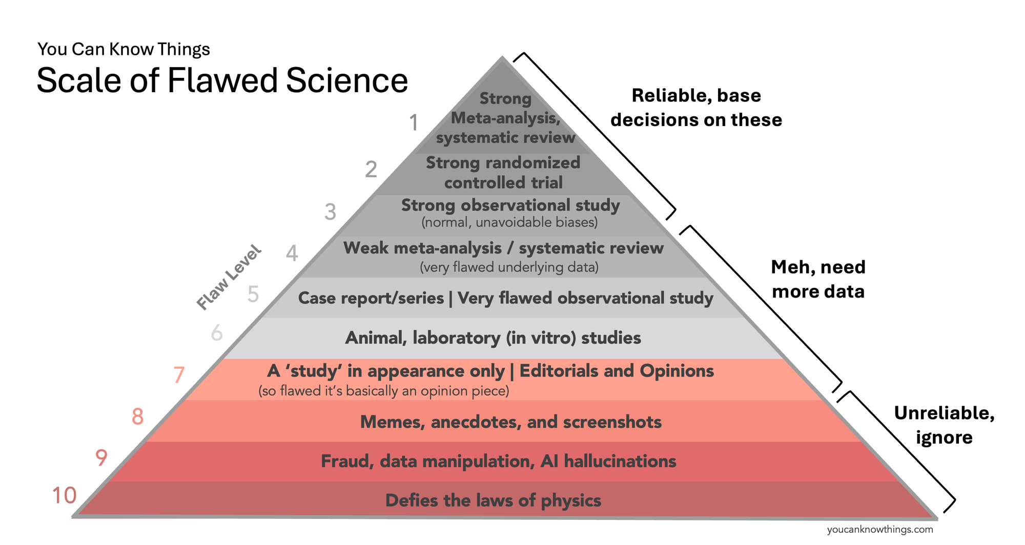 Inspired by the Space City Weather Flood Scale, I have decided to create a You Can Know Things Scale of Flawed Science. It’s not a replacement for the evidence pyramid taught in medical school, but a simplified tool to help the public better understand the quality of scientific evidence. Ultimately, what we care about is whether sources gives us reliable information that we can use to make medical decisions. So for each level, we'll answer that question.