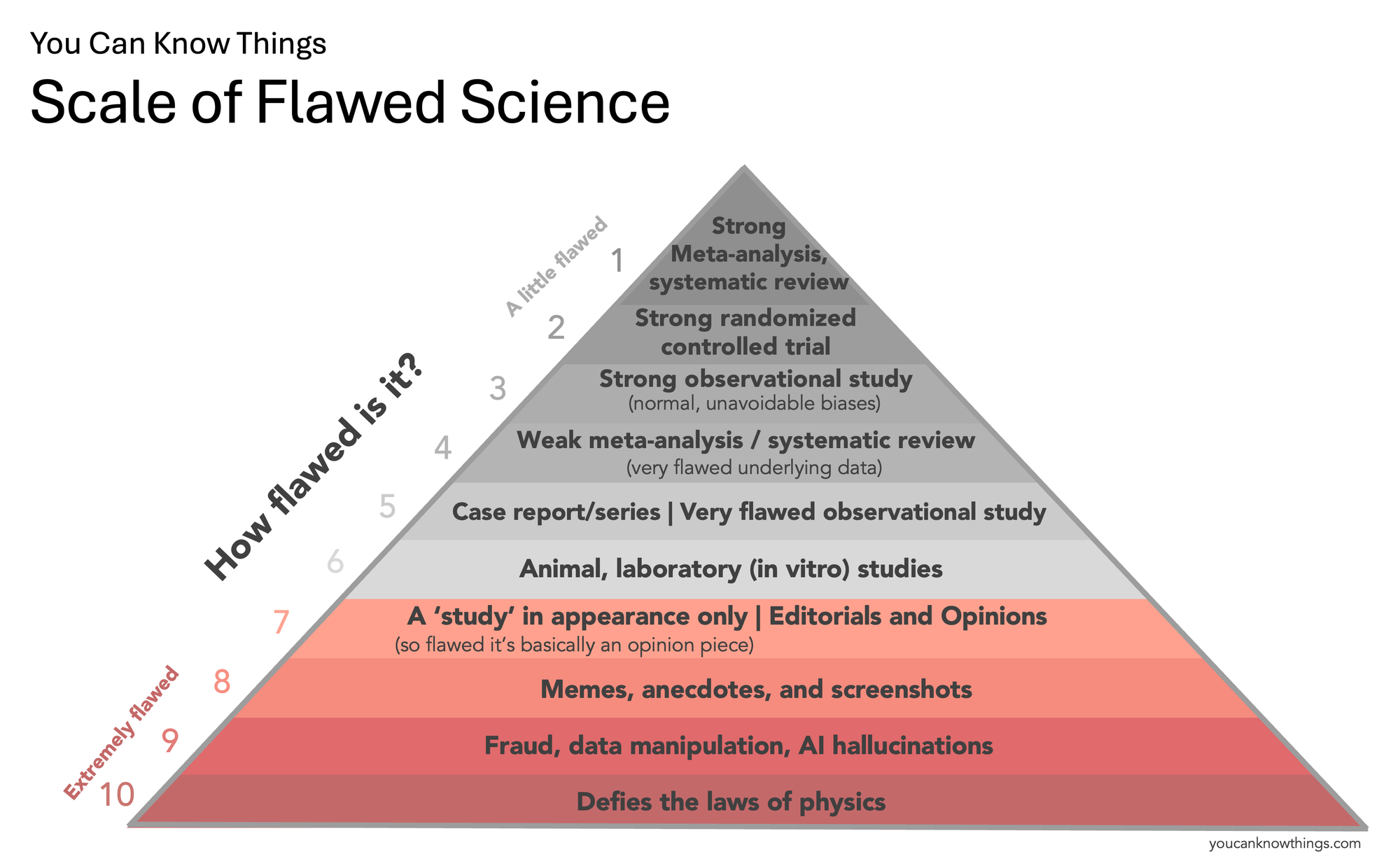 Note there is no level for "zero flaws" on this scale – you can always find some weakness or limitation in even the best study. Science is a messy, imperfect process, and this is normal. The trick is distinguishing studies that have these "normal" kinds of flaws from the truly abysmal ones. That's what this scale aims to do.