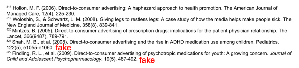 Similarly, there is no real paper matching the citation "Direct-to-consumer advertising and the rise in ADHD medication use among children" allegedly published in the journal Pediatrics.