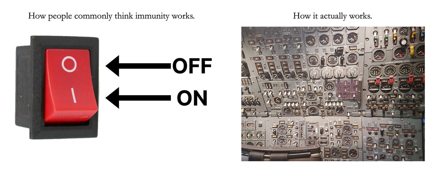 But it’s not. The immune system is one of the most complicated systems in the human body, and the degree of protection it provides is not all or nothing. Both vaccine-induced and disease-induced immunity provide varying degrees of protection — for some vaccines the protection is very strong, and others (like the flu vaccine) it’s more moderate. And some infections induce very little immunity at all. (There are also vaccines prototypes that induce very little immunity, but they don’t make it past being a prototype.)