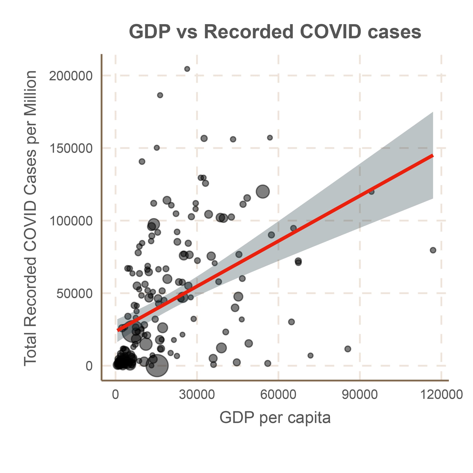 But that isn’t even the biggest issue. The main issue here is that these results are highly influenced by confounding. Confounding occurs when there appears to be a relationship (or lack of relationship) between two variables of interest (in this case, COVID cases per million and vaccination rate), but both of these variables are actually influenced by a third variable, which in turn influences the results we see. And what is that confounding variable in this case? Wealth.