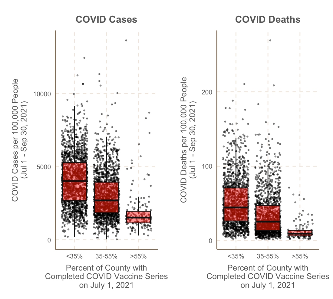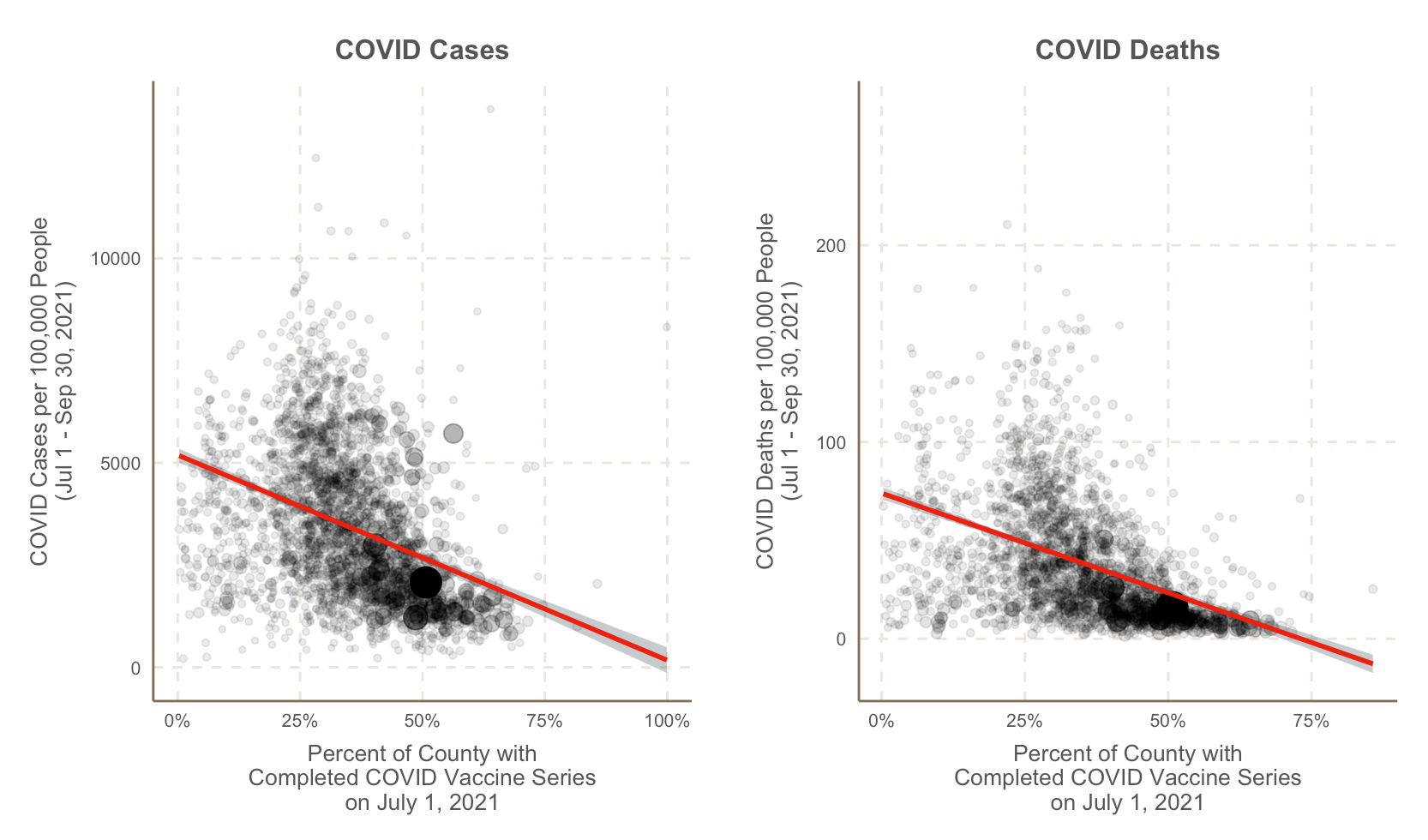 Correlation between US county-level vaccination rate on July 1, 2021 and county-level COVID cases (left, R = -0.36 , p < 0.00001) and deaths (right, R = -0.42, p < 0.00001) per 100,000 people during summer 2021 (July 1 – Sep 30, 2021). To exclude counties with delayed/insufficient reporting, this analysis includes all counties with at least one completed vaccination reported (vaccination rate > 0%) and at least one COVID case or death reported, respectively.