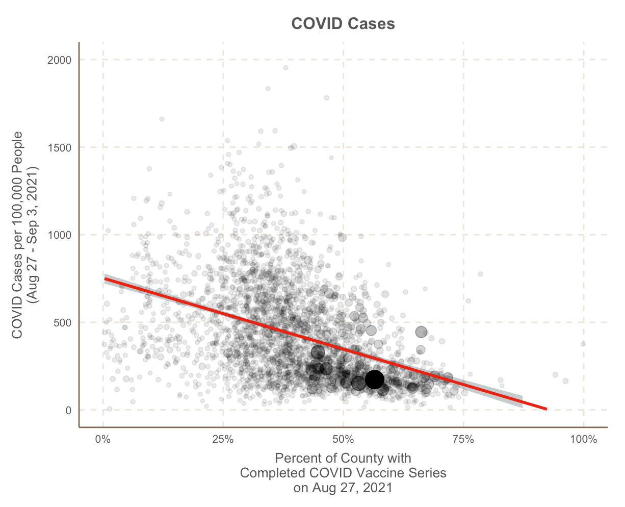There is clearly a correlation between higher vaccination rates and lower COVID cases across US counties, even when only looking at that random week preceding September 3, 2021. If they had simply repeated the analysis they had done for the 68 countries and run any statistics, they would have discovered this.
