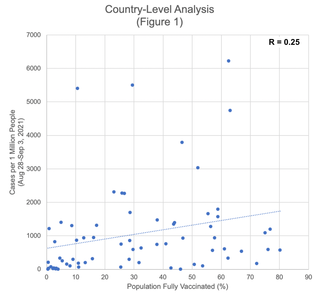 They conclude that there “appears to be no significant signaling of COVID-19 cases decreasing with higher percentages of population fully vaccinated (Fig. 3).” The results they found, said simply, were that COVID cases were increasing nearly everywhere, regardless of vaccination status.