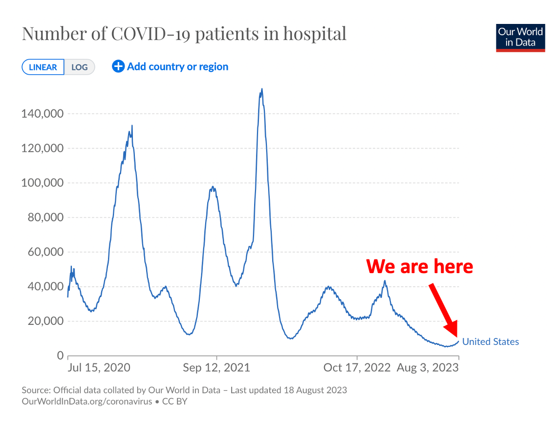 Personally, to avoid COVID precaution-burnout, I have my own set of precautions that I ratchet up when COVID is circulating at higher levels (mostly masking indoors in crowded areas), and then relax a little more when cases go back down. Based on this data, after a nice spring and summer of falling COVID levels, I’m ratcheting back up those precautions, and keeping an eye on BA.2.86.